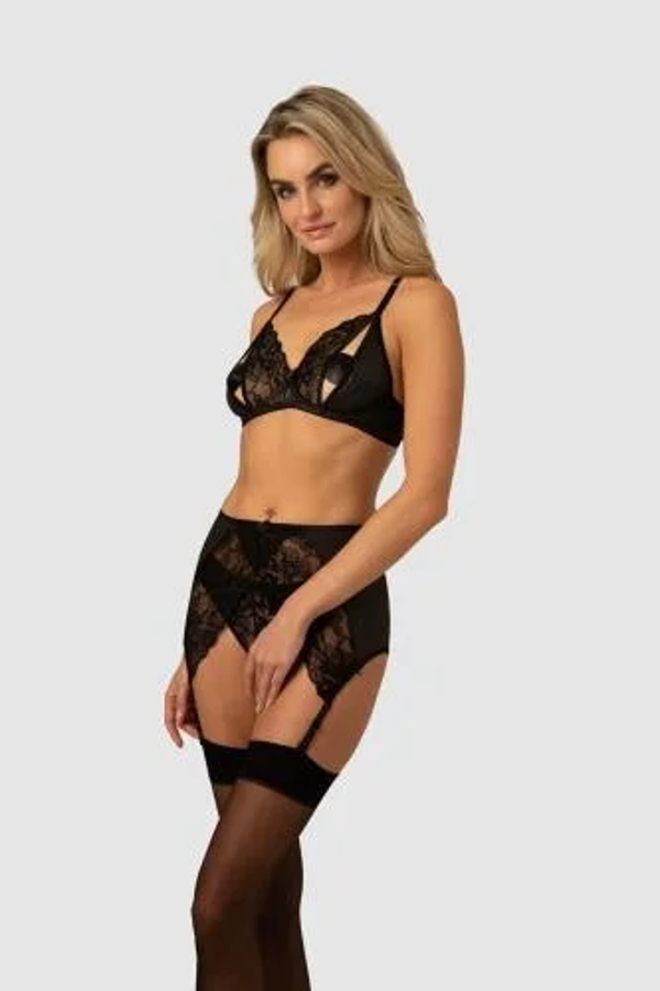 3-teiliges Set bestehend aus einem BH mit offenen Cups, einem breiten Strapsgürtel und einem Tanga ohne Schritt. Gefertigt aus elastischer Wetlook-Qualität kombiniert mit Spitze. Schöne Passform und feminine, sinnliche Linien. Enthält nicht die abgebildeten Strümpfe. Verstellbare Schulter- und Strapsgurte. Der BH hat stützende Bügel und einen Klettverschluss am Rücken.