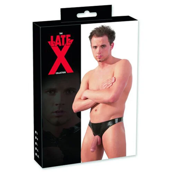 Knapper schwarzer Showmaster-Slip mit enger Öffnung vorne, durch die Penis und Hoden für Präsentationszwecke ganz groß rauskommen!Latex (hergestellt unter der Verwendung von Naturkautschuklatex, der Allergien verursachen kann)